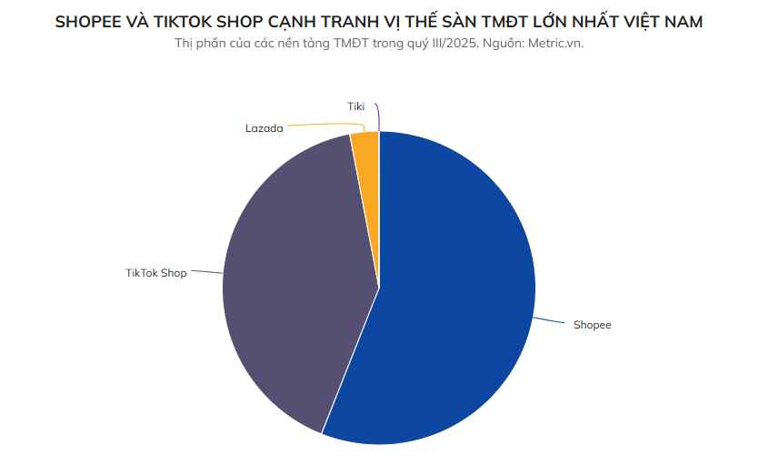 Trong quý III, Shopee tiếp tục dẫn đầu thị trường với 56% thị phần dù chỉ ghi nhận mức tăng trưởng doanh số nhẹ 4% so với cùng kỳ năm 2024, phản ánh dấu hiệu chững lại trong bối cảnh cạnh tranh gia tăng.