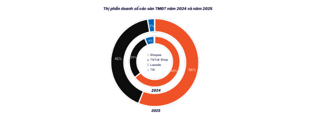Theo báo cáo từ nền tảng tổng hợp và khai thác dữ liệu Metric.vn, TMĐT Việt Nam năm 2025 chứng kiến sự tăng trưởng về tổng doanh thu 4 sàn thương mại điện tử (TMĐT), cán mốc 429,7 nghìn tỷ đồng, tăng trưởng gần 35%. Tuy nhiên, tính theo thị phần, hiện tại 2 “ông lớn” là Shopee và TikTok Shop đã chiếm tới 97%, 3% thị phần còn lại dành cho Lazada và Tiki. Thị trường gần như chỉ còn là sân chơi riêng của hai “ông lớn”, cùng sự thanh lọc mang tính quy mô đối với các nhà bán lẻ.
